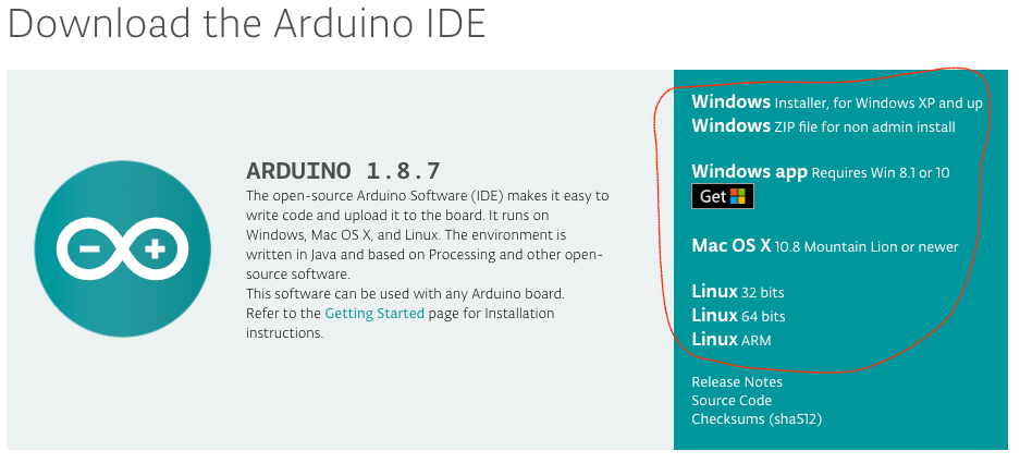 Download en installeer de meest actuele versie van de Arduino Integrated Development Environment (IDE) voor het Operating Systeem (OS) waar jouw Desktop of Laptop computer (er zijn versies voor Windows, Linux en Mac) mee werkt. Je kunt de Software hier downloaden.