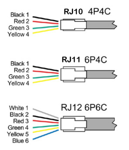 RJ11 en RJ12 zijn even breed en passen in dezelfde female connector, maar bij de eerste maken alleen de 4 binnenste contacten verbinding terwijl bij de RJ12 alle 6 de contacten verbinding maken. Ook de RJ10 stekker past in een RJ12 female connector maar ook dan worden alleen de binnenste 4 contacten met elkaar verbonden.