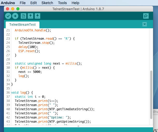Klik je nu op[TelnetStreamTest]dan wordt dit voorbeeld programma in de Arduino IDE geladen.