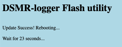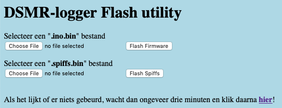 Let op!Het komt regelmatig voor dat het scherm niet automatisch ge-refreshed wordt (dit lijkt te maken te hebben met de omvang van de firmware die je upload). Klik in dat geval, na ongeveer 3 minuten, op de tekst Als het lijkt of er niets gebeurd, wacht dan ongeveer drie minuten en klik daarna hier. Als de verbinding met de server vóór die tijd verbroken wordt klik dan op de `back` knop van de browser waarna de tekst alsnog (weer) verschijnt. Klik nu op **hier** om de DSMRloggerWS hoofd pagina opnieuw te laden.