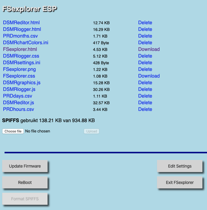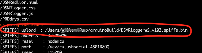 Let op!Hou er rekening mee dat eventuele data-bestanden die al op SPIFFS stonden nu weg zijn! Als je ze niet kwijt wil moet je er eerst een kopie van maken op je computer en deze, na het flashen van SPIFFS weer terug zetten (dat kan met de DSMR-logger FSexplorer