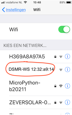 Als daar een WiFi AP met de naam DSMR-WS xx-yy-zz tussen staat maak je daar verbinding mee. Er kunnen nu twee dingen gebeuren: