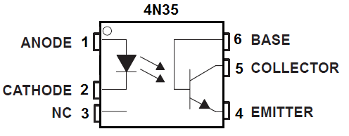 Er zijn verschillende varianten van de 4N35 opto-coupler. Hieronder drie afbeeldingen waarmee je kunt identificeren wat pin 1 van de 4N35 is: