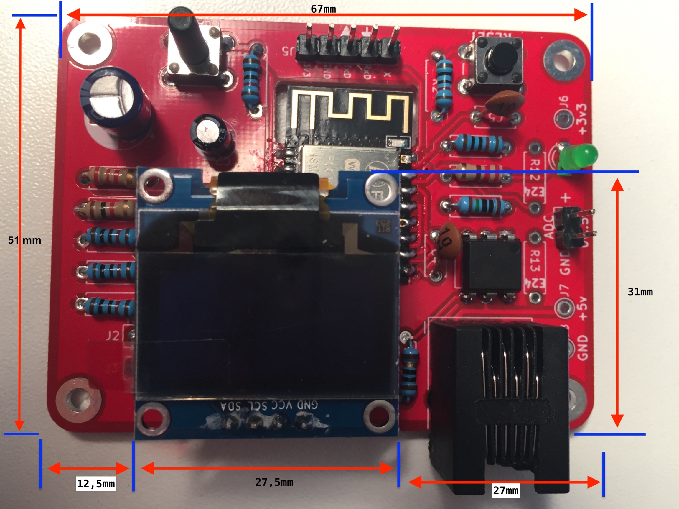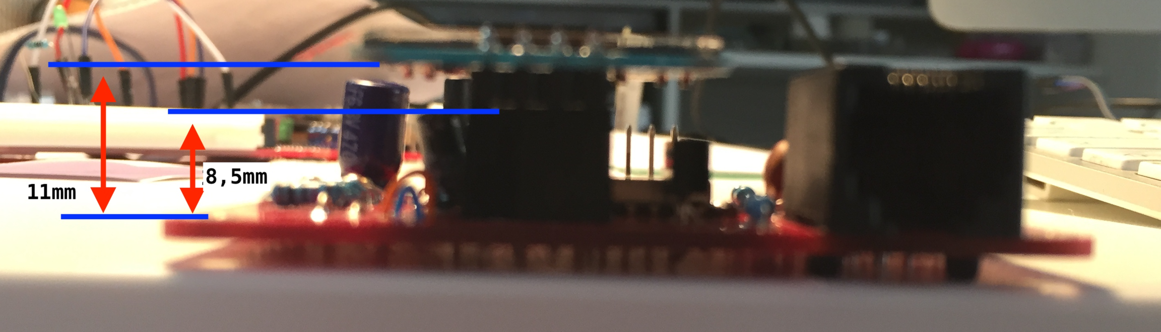 De J4 steekt 8,5mm boven de printplaat. De onderkant van het Oled-schermpje steekt 11mm boven de printplaat.