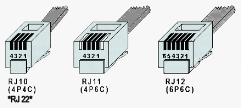 RJ11 en RJ12 zijn even breed en passen in dezelfde female connector, maar bij de eerste maken alleen de 4 binnenste contacten verbinding terwijl bij de RJ12 alle 6 de contacten verbinding maken. Ook de RJ10 stekker past in een RJ12 female connector maar ook dan worden alleen de binnenste 4 contacten met elkaar verbonden.