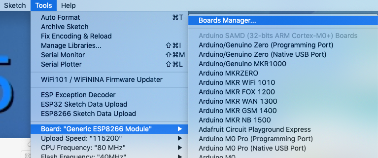 Ga nu via de ArduinoIDE menu-balk naar [Tools] -> [Board] -> [Boards Manager].