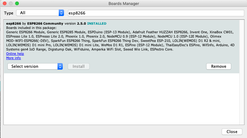 Voer bij filter “esp8266” in.